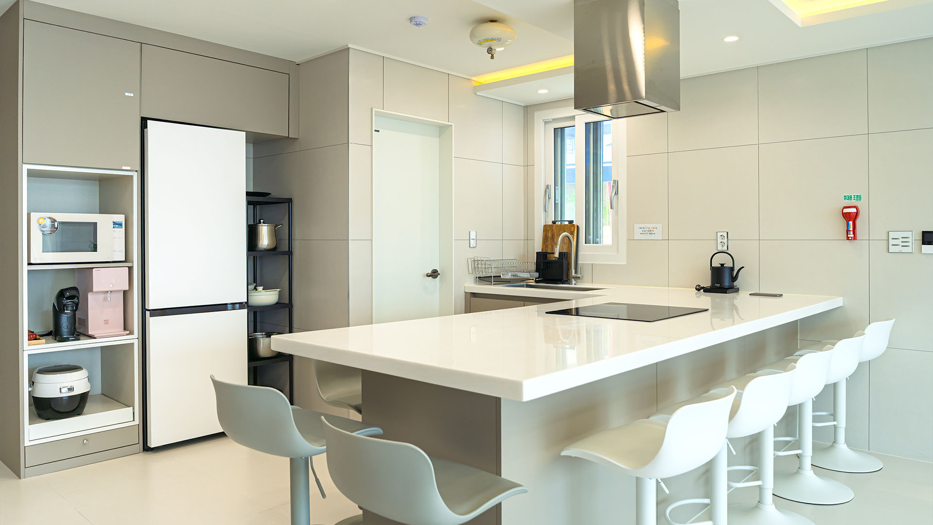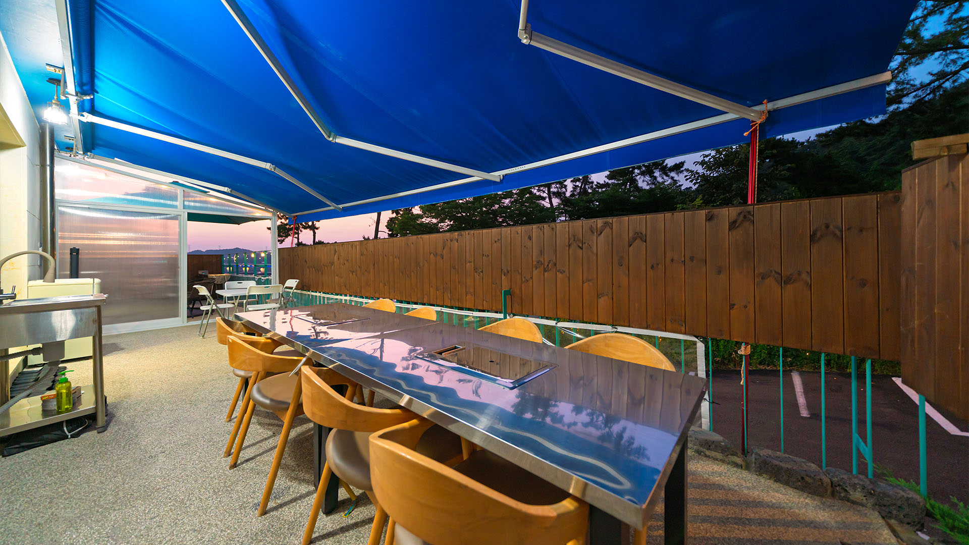 단체 식사가 가능한 넉넉한 테이블과 의자 세팅이 준비되어 있으며,