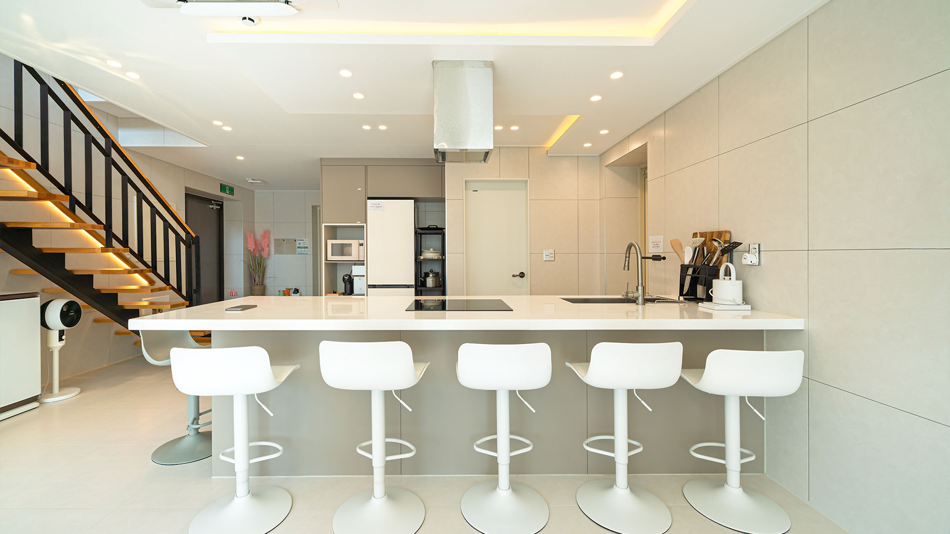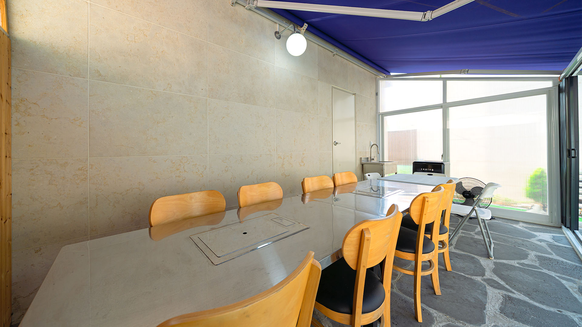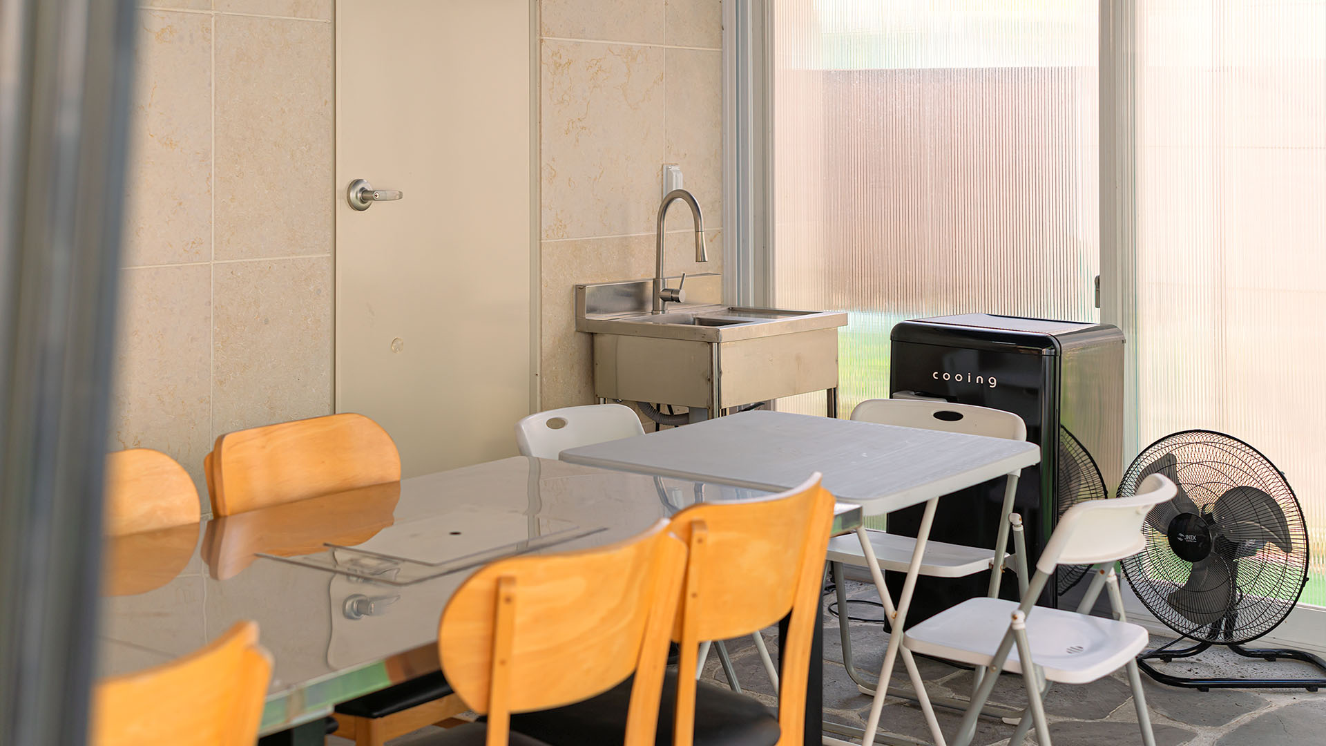 단체 식사가 가능한 넉넉한 테이블과 의자 세팅이 준비되어 있으며,